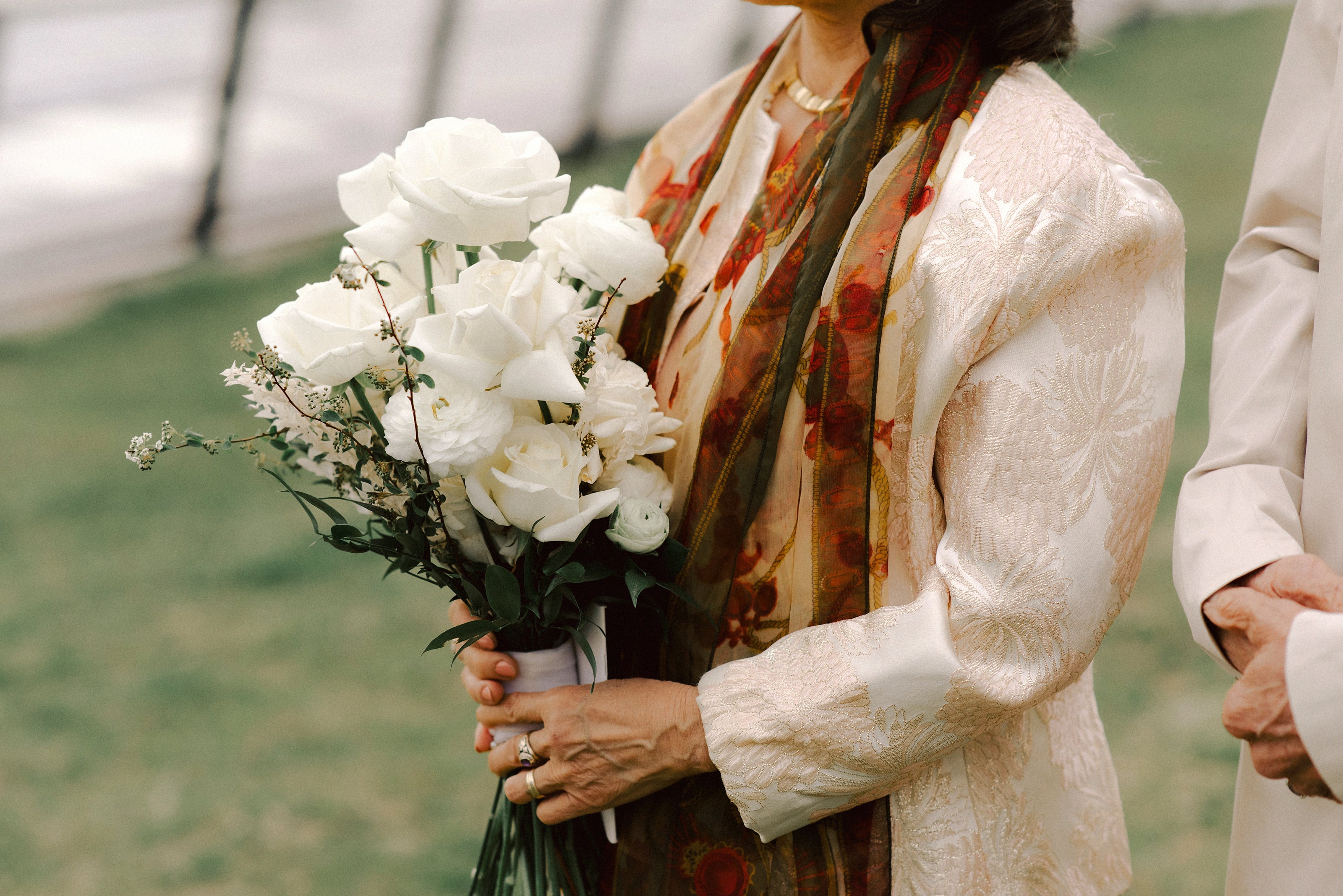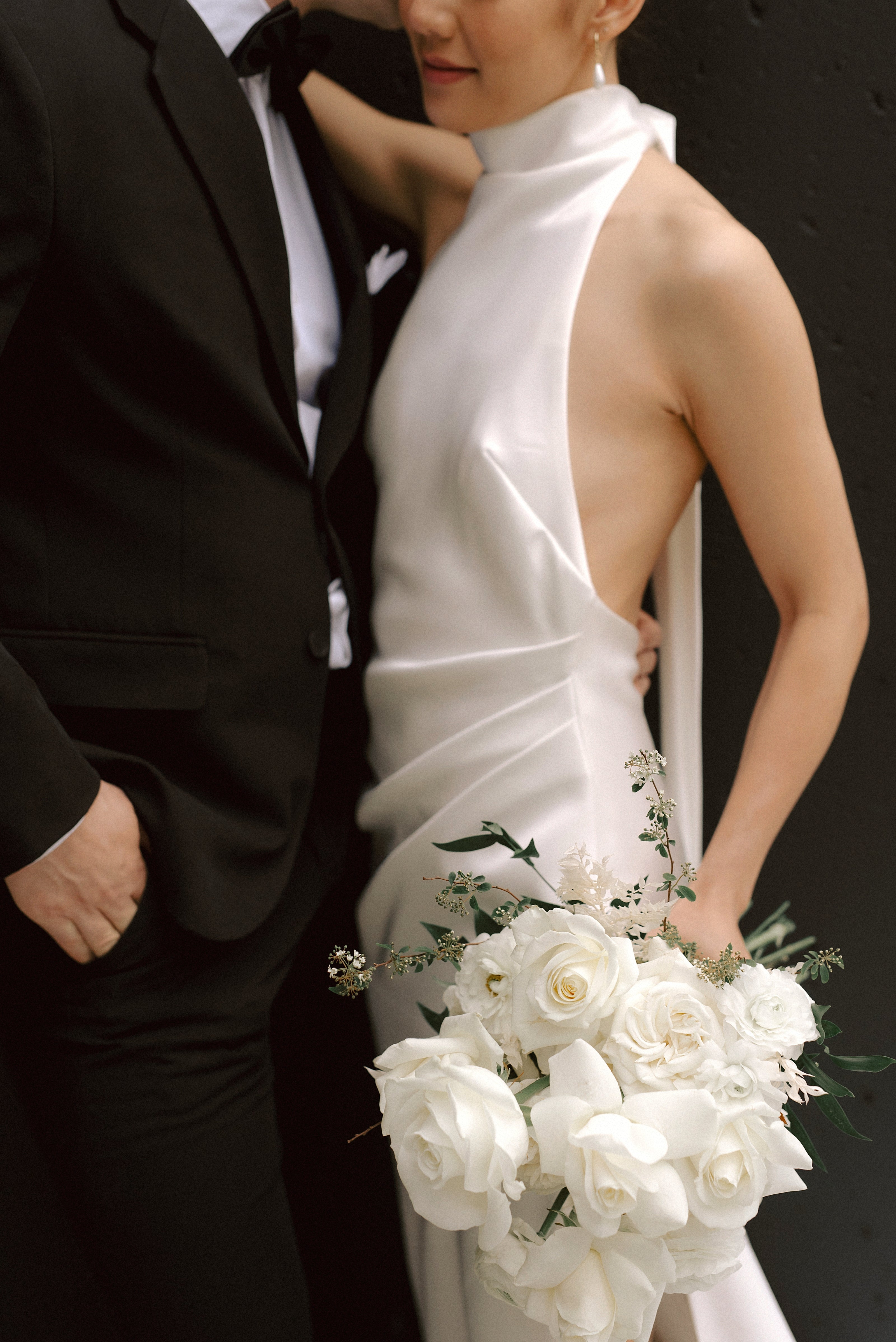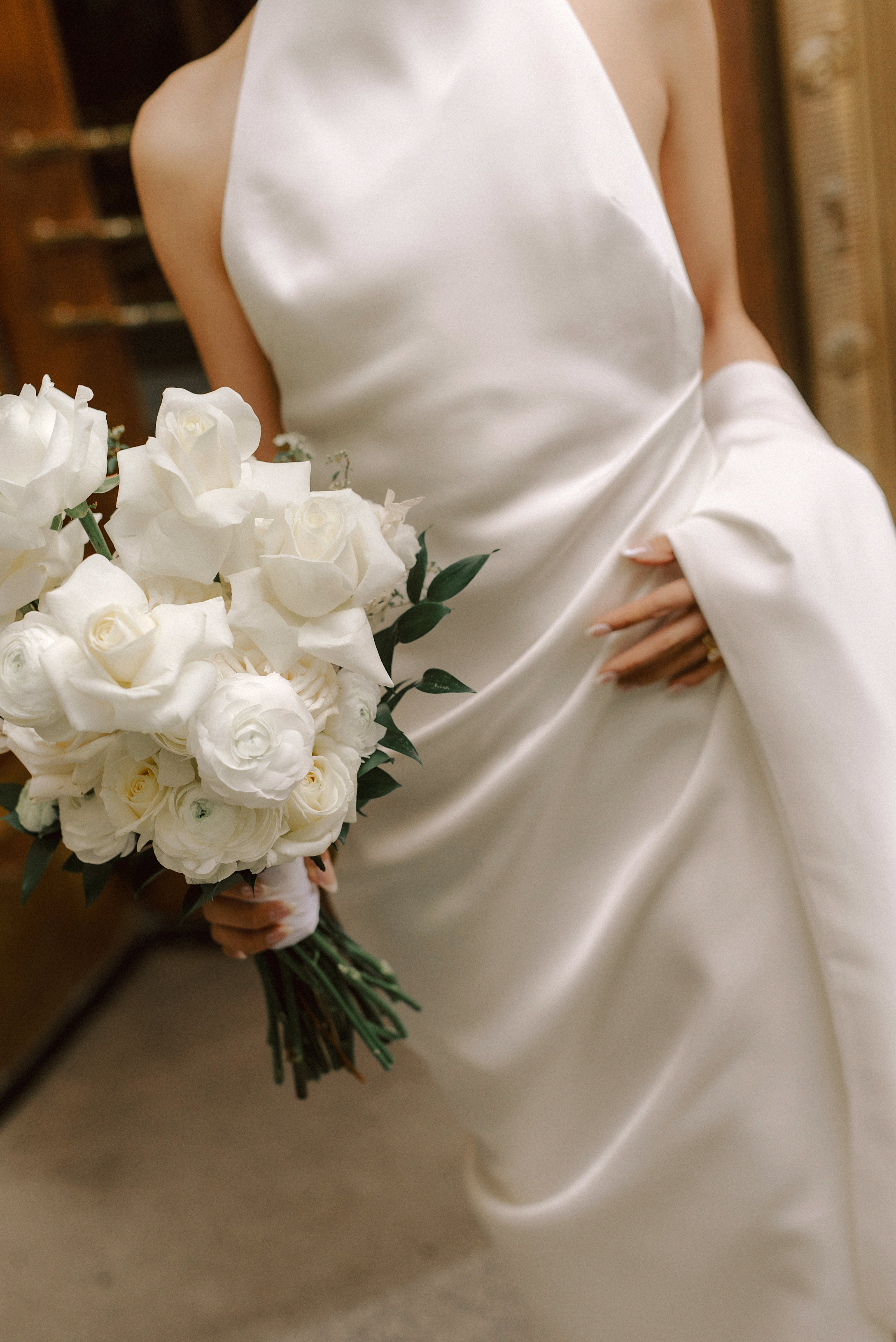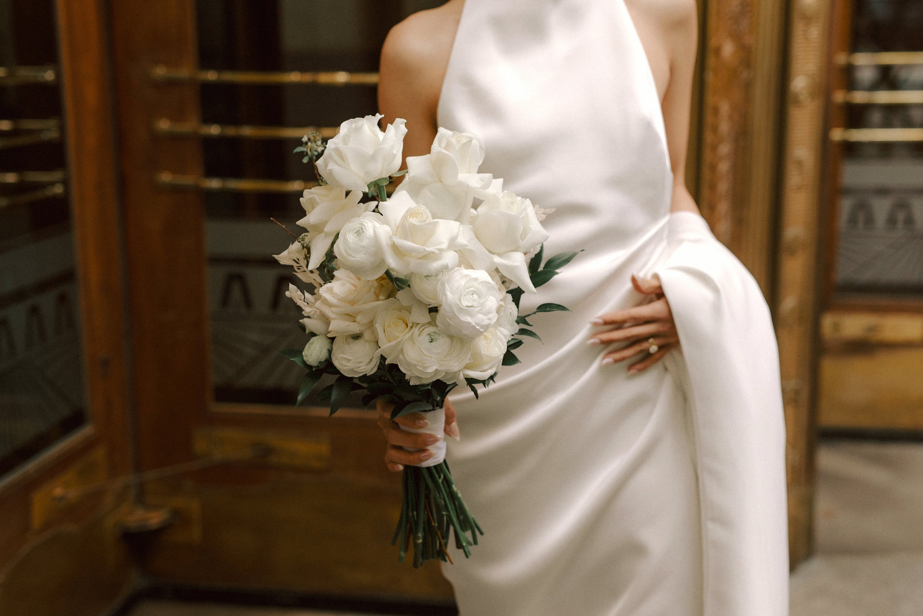 Noah and Annie’s elopement was a celebration of modern romance, featuring a timeless and elegant aesthetic. Annie envisioned a bouquet of long-stemmed white roses, beautifully paired with delicate ranunculus, airy spirea, and subtle greenery accents. The result was a stunning arrangement, perfectly crafted for her magazine-worthy wedding photos.