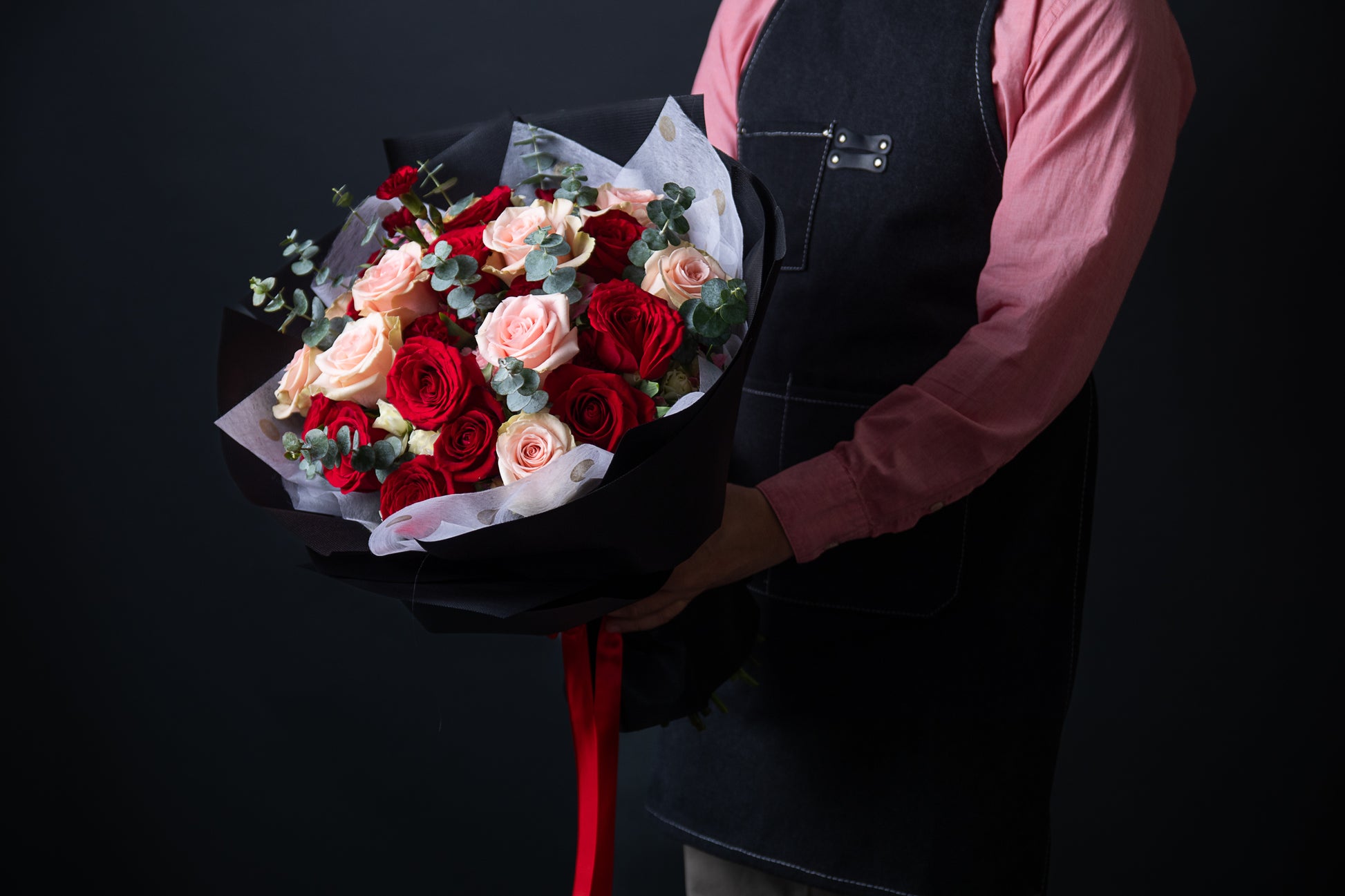 This bouquet features 24 stems of roses combined with in-season flowers to complement the deep hues of red, pink, or white. Each arrangement is wrapped elegantly in waterproof paper and satin ribbon.