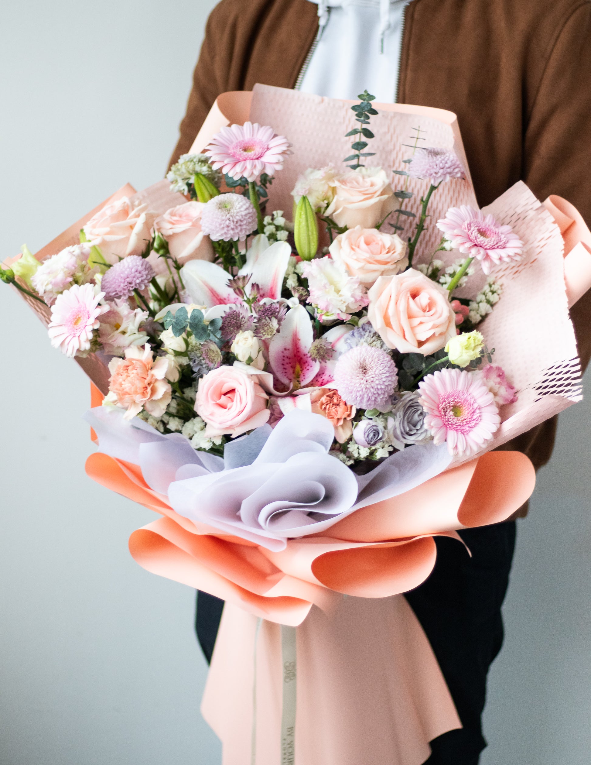 Elara is soft, dreamy, and sophisticated. This luxurious bouquet features a harmonious blend of delicate light pink to blush in season flowers. Each bloom is thoughtfully arranged to evoke an ethereal, romantic feel, making it perfect for celebrating love, beauty, and timeless elegance.