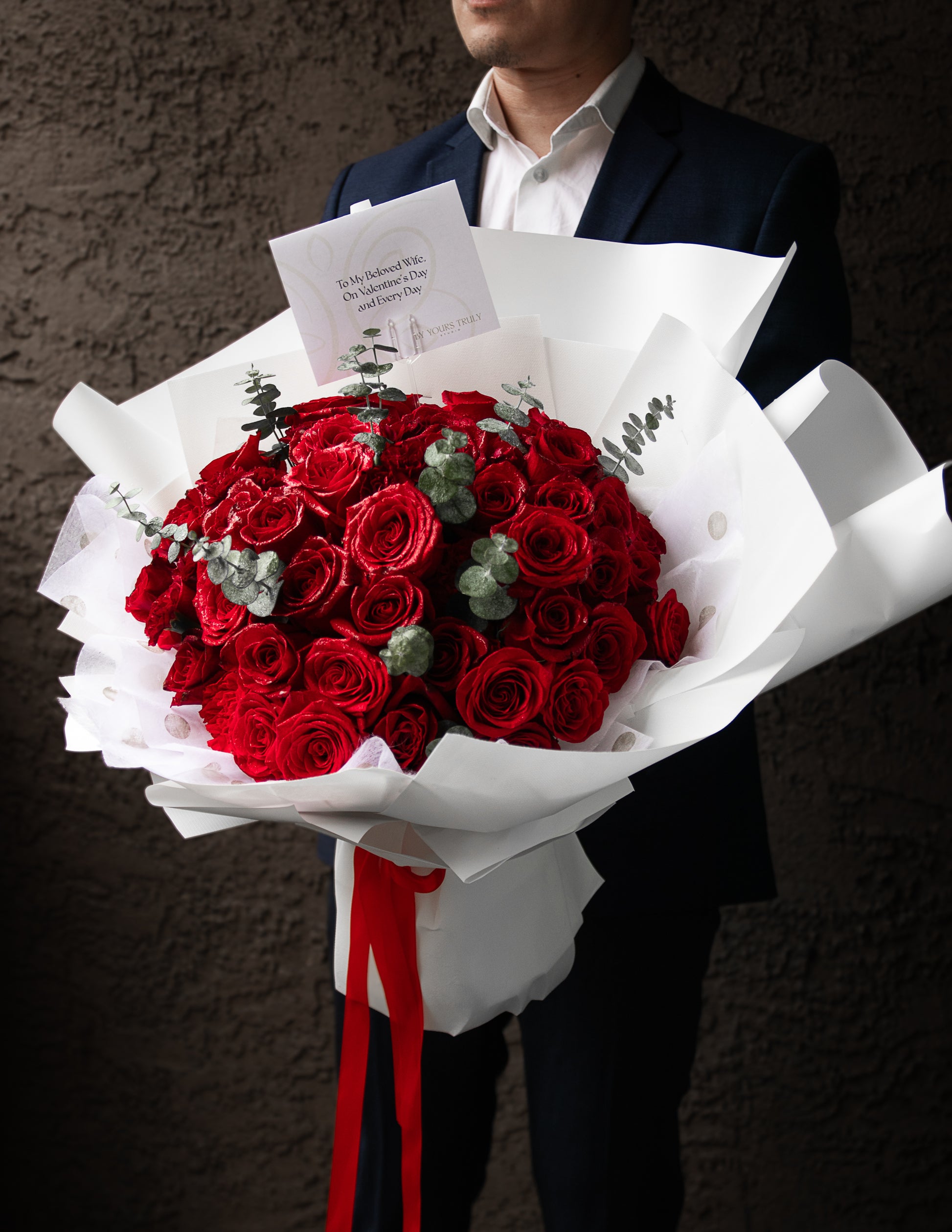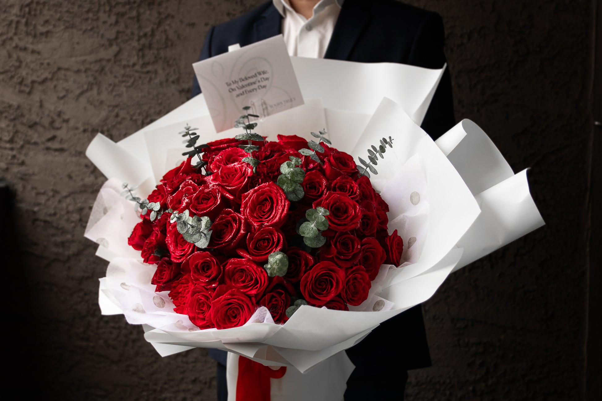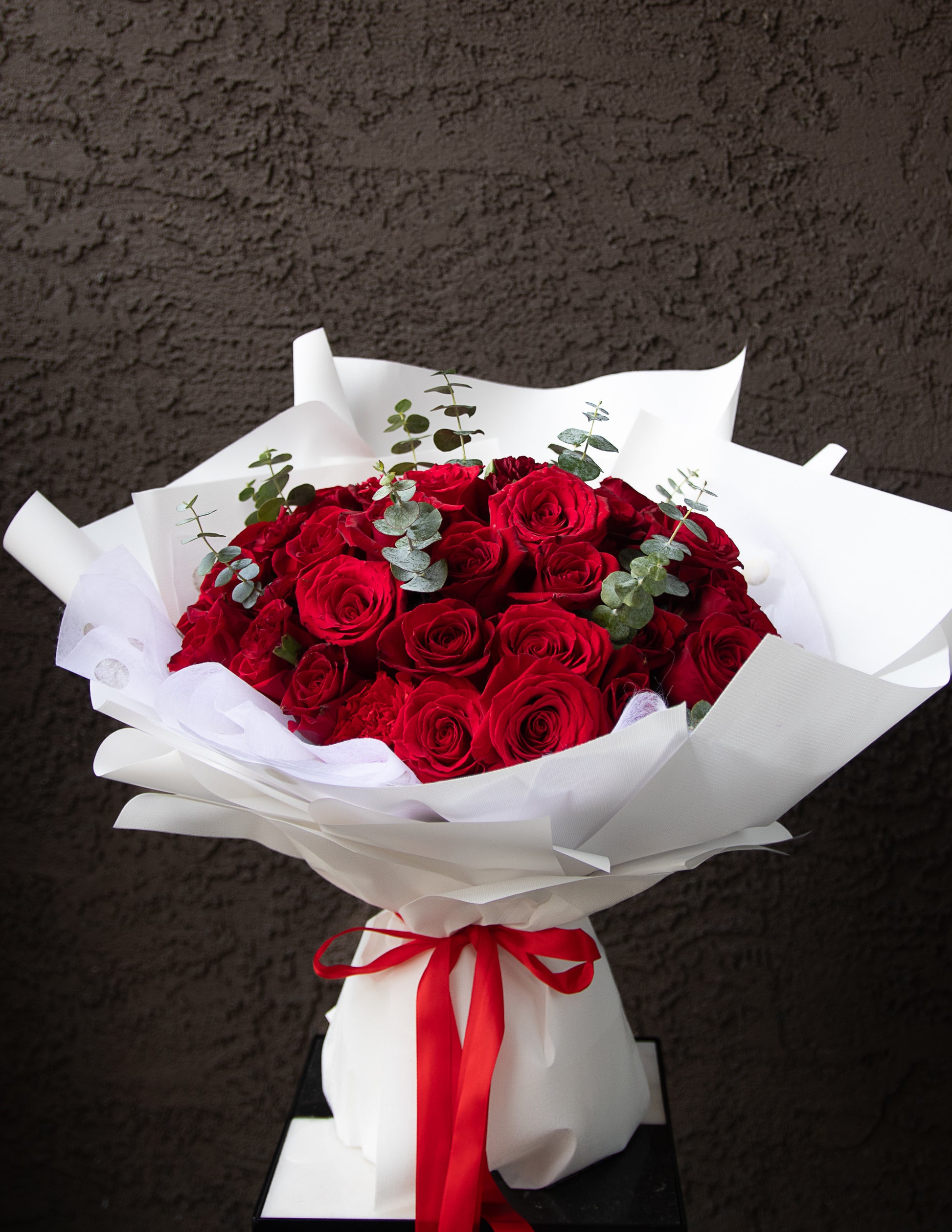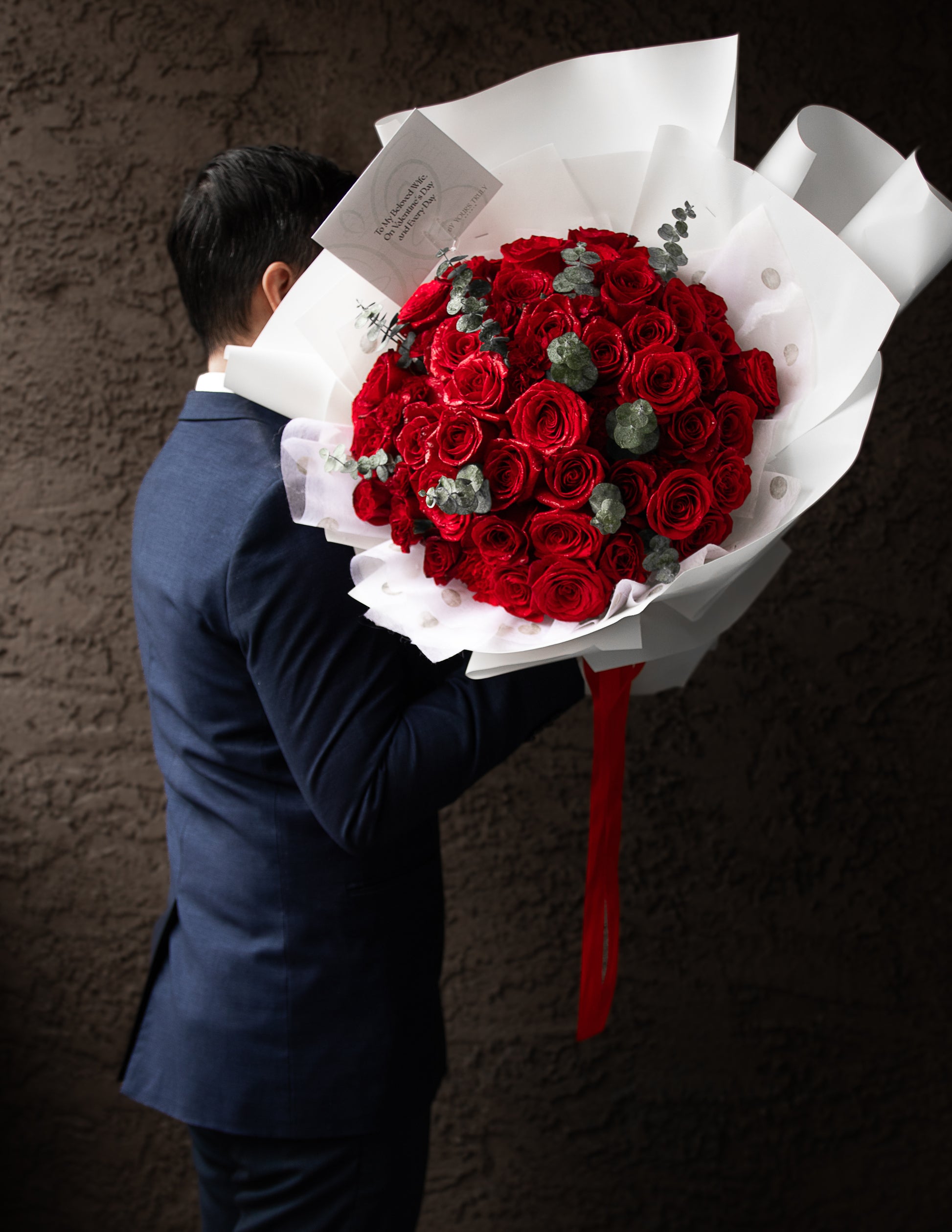 Prepare for date night in style! Elevate your evening with our exquisite "LEONOR" bouquet - a lavish arrangement of 50 stems premium roses, meticulously hand-tied and crafted with love by Yours Truly. This bouquet features 50 stems of large roses combined with in-season flowers to complement the deep hues of red, pink, or white. Each arrangement is wrapped elegantly in waterproof paper and satin ribbon.