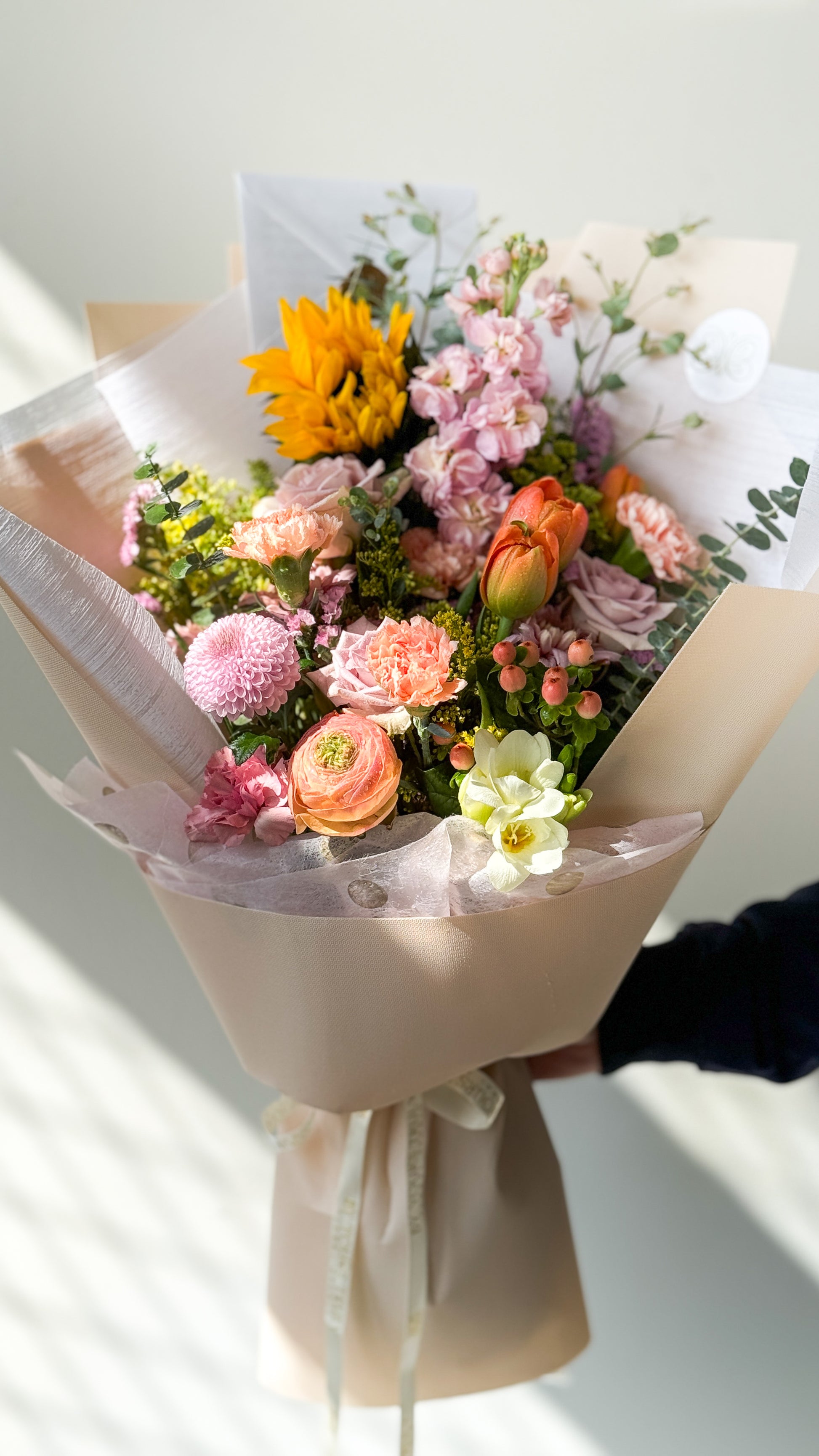 This meticulously hand-tied and crafted bouquet features in season bright and vibrant flowers such as Sunflowers, Momoko, Lisianthus, Roses, Matthiola, Lilies, Orchids, and other varieties.