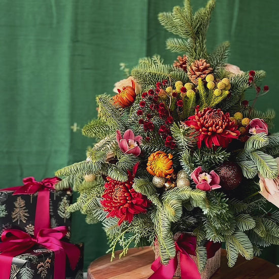 A classic and sophisticated tabletop mini Christmas tree adorned with fresh seasonal blooms, Douglas or Noble Fir, and festive accents. Velvet Noel captures the warmth and elegance of the holidays in a petite, beautifully designed form.